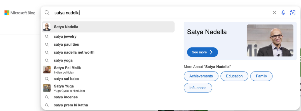 Here is a screenshot of this feature in Bing Search for Microsoft’s CEO:
